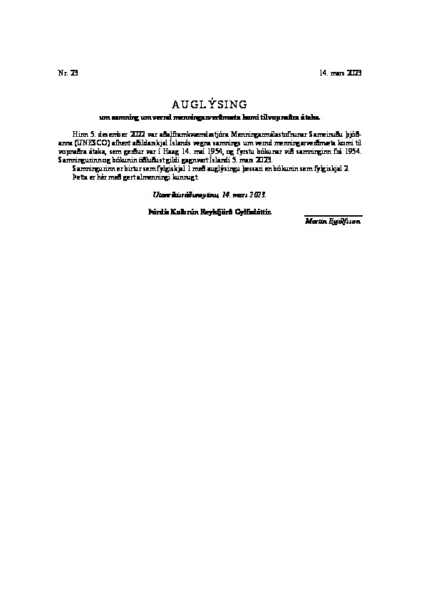 On 12 December 2022, Iceland ratified the 1954 UNESCO Hague Convention for the Protection of Cultural Property in the Event of Armed Conflict. The ratification of the convention was carried out in collaboration with the Ministry of Culture and Trade and the Ministry of Foreign Affairs. Almost all European countries have now ratified the convention.